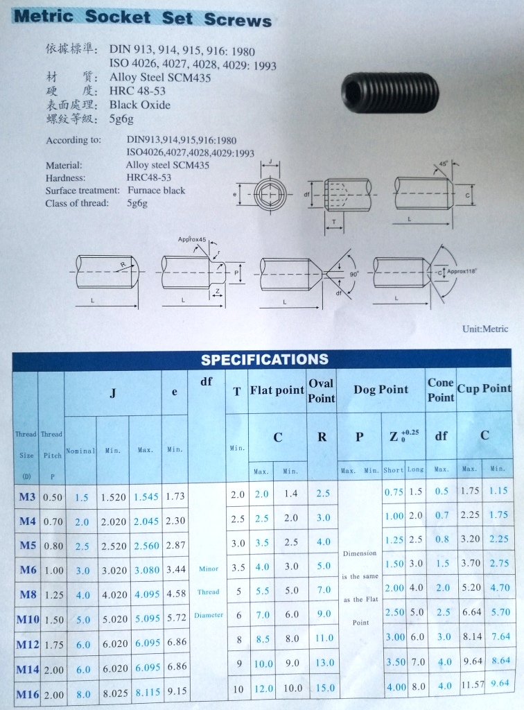 內(nèi)六角尖端緊定,生產(chǎn)標(biāo)準(zhǔn):DIN914,材質(zhì):合金鋼,強度等級12.9級,常用螺紋直徑M3-M16,長度:6mm--60mm,也可接受非標(biāo)訂做。